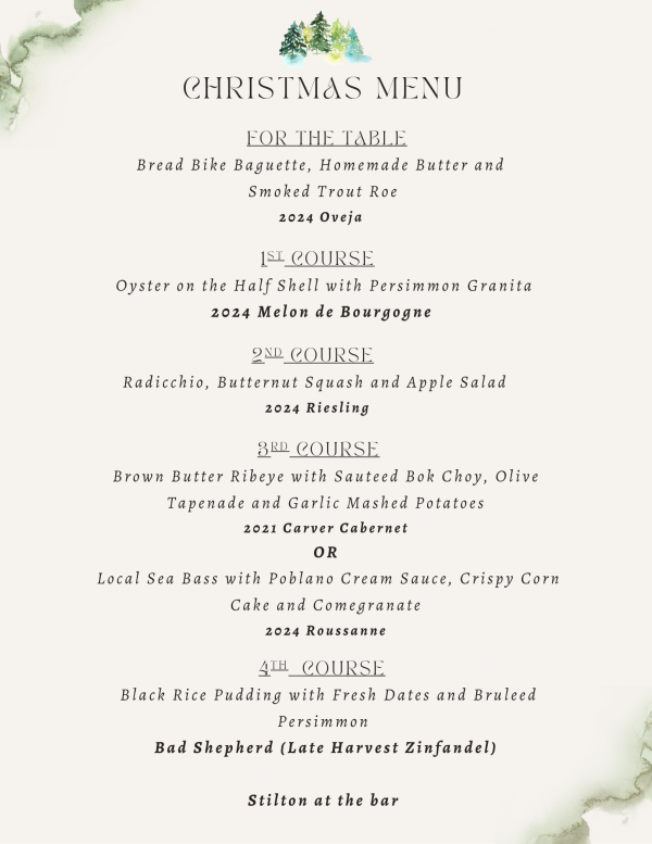 Make a reservation and come in anytime between 5:00 and 7:00 PM. Order your food from the chef’s table and casually place your wine order in the tasting room for your table. Find a seat at a shared community table, settle in, and enjoy your evening with us on the patio!