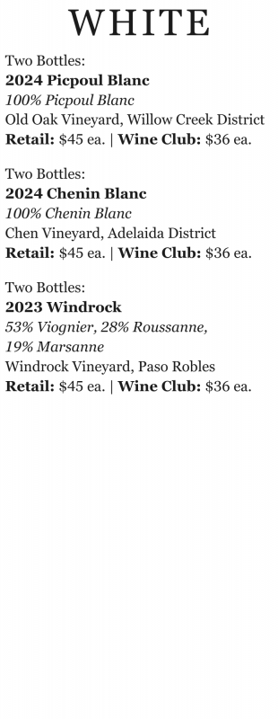 - 2023 Windrock - 53% Viognier, 28% Roussanne, 19% Marsanne | Windrock Vineyard, Paso Robles | Retail: $45 Member: $36